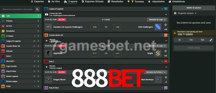 A 888Bet oferece uma seleção abrangente de opções de apostas em e-sports. Com uma ampla variedade de jogos para escolher, incluindo League of Legends, Dota 2 e CS:GO, há algo para todos os fãs de esportes eletrônicos. Além das apostas pré-jogo, a 888Bet também oferece opções de apostas ao vivo para muitos de seus eventos de e-sports. Portanto, seja você um novato em apostas em e-sports ou um profissional experiente, a 888Bet bet tem tudo o que você precisa para começar.